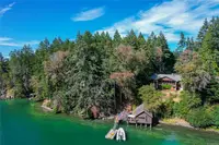 Spread out with guests on the walk-out lower level with a family room, bedroom, bathroom as well as storage. Attached is a 2-car garage wired for EV charging, a small detached workshop, and a garden storage shed. Most unique and exciting is the 1960's boat house perched directly above the emerald green water with an adjacent boat launch sized for boats up to 20 feet.