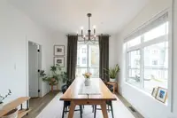 Upstairs, the 2nd level opens into a bright, expansive living space where the kitchen, dining, & living areas flow together, anchored by an oversized quartz island that is perfect for everyday living & hosting. Thoughtful upgrades include quartz countertops throughout, black hardware, & custom built-in electric fireplace. A front deck extends the living space outdoors.