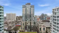 Gorgeous, bright 8th floor 1 bedroom + 1 bathroom condo that shows like new, offering beautiful city views and an efficient, contemporary layout. The modern one-wall kitchen features immaculate cabinetry, quartz countertops, a full-height backsplash, and stainless steel appliances including fridge, stove, dishwasher and over-the-range microwave. The spacious bedroom includes closet space with in-suite washer and dryer, and convenient access to the sleek bathroom.