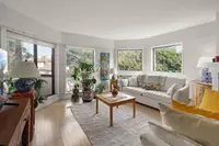 The open living and dining areas flow seamlessly into a bright sunroom—an ideal space for a home office, reading nook, or indoor garden. Tucked away on the quiet back side of the building, the unit enjoys a peaceful outlook over mature trees and gardens, including an apple tree and rhododendrons—an unexpected oasis in the city. The spacious primary bedroom includes its own ensuite, while the second bedroom offers flexibility for guests or work-from-home needs.