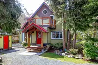 The upper level offers three bedrooms and two private decks, while an additional bedroom on the main floor adds flexibility. Two bathrooms complete the layout. Step outside to a private, tree-lined backyard featuring raspberry and rhubarb gardens, banana trees, and vibrant rhododendrons—stunning in bloom.