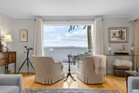 Inside, maple hardwood floors, crown moulding, & a fir staircase speak to timeless craftsmanship. The chef's kitchen features quartz counters, a propane range, & an island for four, flowing effortlessly into dining & breakfast rooms with sweeping ocean views. The primary suite offers a walk-in closet w/built-in cabinetry & a spa-inspired bath w/pedestal tub, dual sinks, & bidet.